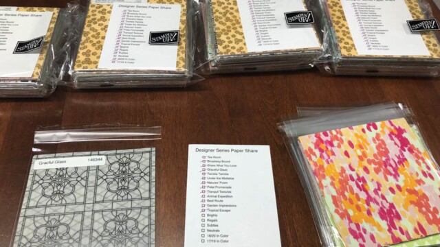 I have three product shares available, Designer Series Paper, Ribbon, and Embellishments or you can get them all in the MEGA share.    The Designer Series Paper, Ribbons, and Embellishments are listed by name and can be seen when you receive your catalog.  (Let me know if you need a catalog)  Trust me….they’re amazing!!