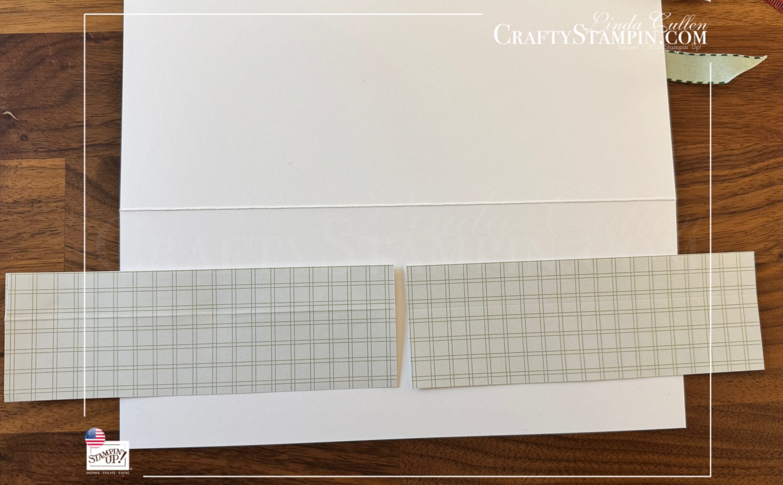 My first card is a slimline card, 3-1/2 x 8-1/2. I used the green printed envelope as my Designer Series Paper, because why waste good paper when it’s right there staring at you. You can see in the photos how I cut up the envelope and turned it into panels. Crafting win, and also a tiny victory over my scrap pile.