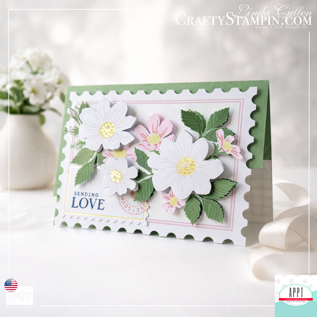 For the postage layers, I used the 3rd largest die from the Perennial Postage Dies to cut three Mossy Meadow postage shapes. The greeting is stamped in Blueberry Bushel Ink, crisp, bold, and perfect with the floral look.