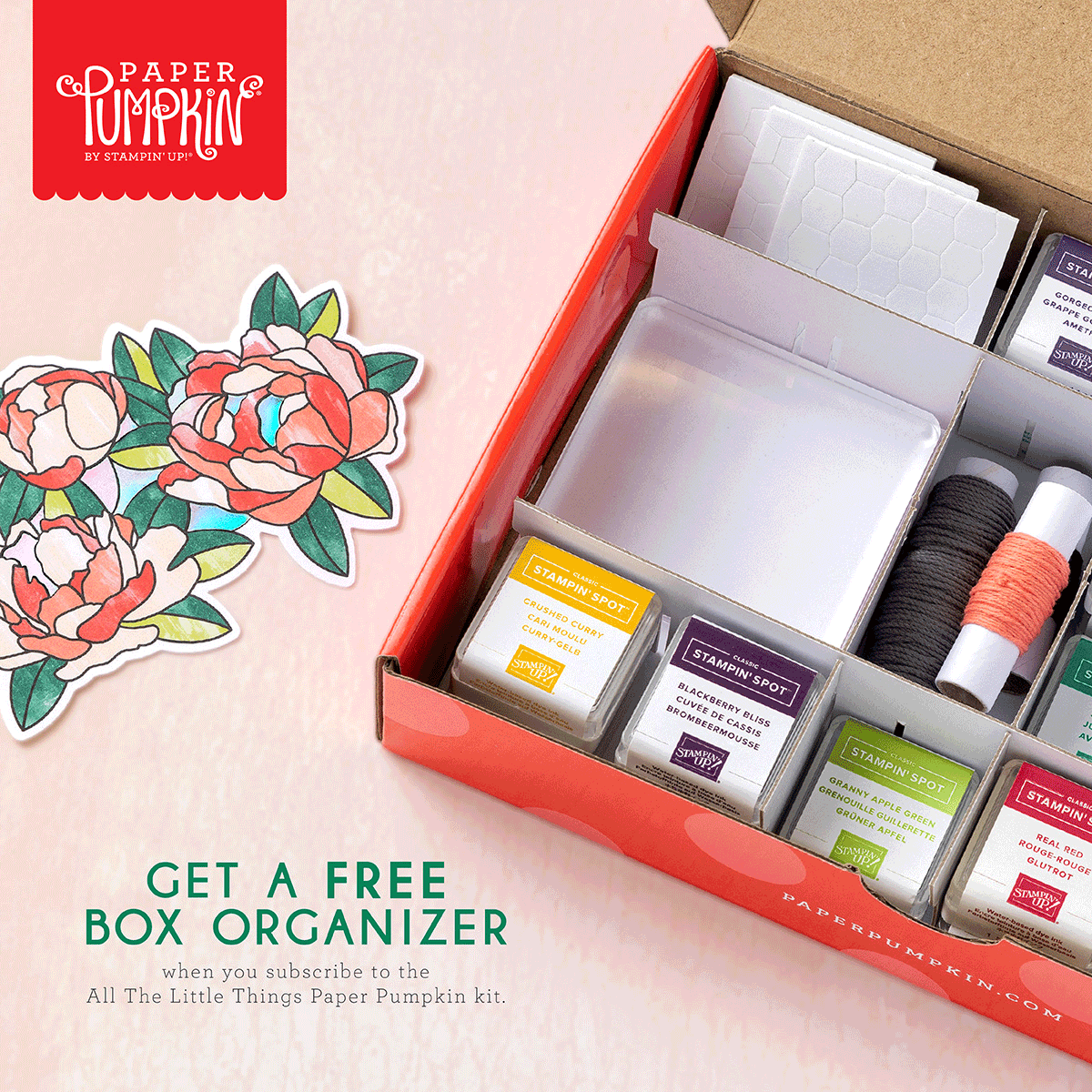 And don’t wait, because anyone who subscribes to this month’s kit will get a FREE box organizer! This organizer fits perfectly inside your Paper Pumpkin box and is great for keeping your supplies from past kits organized, so you know right where everything is!