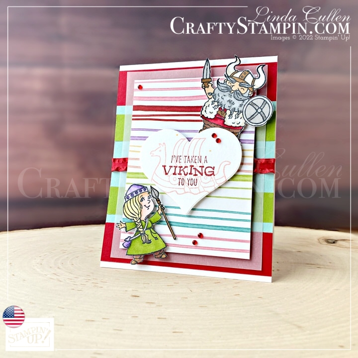 OMG – how cute!!!!  “I’ve taken a VIKING to you.” I’m loving the Brave Vikings Stamp Set for Valentine’s Day cards.  I started this card by creating a color-blocking background with the cardstock in the month’s envelop.  After I created the background, I had wished I added some more Real Red in the center, so I grabbed the Real Red 3/8″ Mini Ruffled Ribbon to fix my error😊. I think it came out better than if had used cardstock.