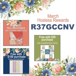 Hostess Code: R37GCCNV I have some great March 2023 Customer Sales Specials for every order placed before March 31st!!! Order between $0 - $149 must use the hostess code: R37GCCNV All orders will receive the Hello, Irresistible Card Tutorial*. Orders over $25 will also receive one Frequent Buyer ...