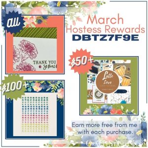 Hostess Code: DBTZ7F9E I have some great March 2024 Customer Sales Specials for every order placed before March 31st!!! Order between $0 - $149 must use the hostess code: DBTZ7F9E All orders will receive the Zinnia Thank You Card Tutorial*. Orders over $25 will also receive one Frequent Buyer Point(s). ...