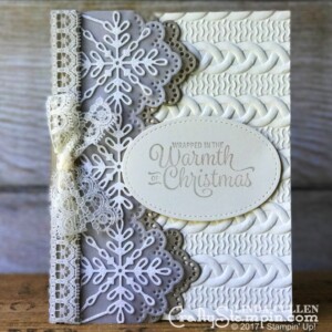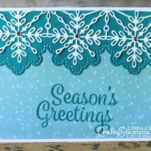 Coffee & Crafts Class: Snowflake Sentiments with Delicate Lace Edgelits | Stampin Up Demonstrator Linda Cullen | Crafty Stampin’ | Purchase your Stampin’ Up Supplies | Snowflake Sentiments Stamp Set | Under the Mistletoe Designer Series Paper | Delicate Lace Edgelits | Stitched Seasons Framelits Dies | Pear Pizzaz 3/8 Shimmer Ribbon
