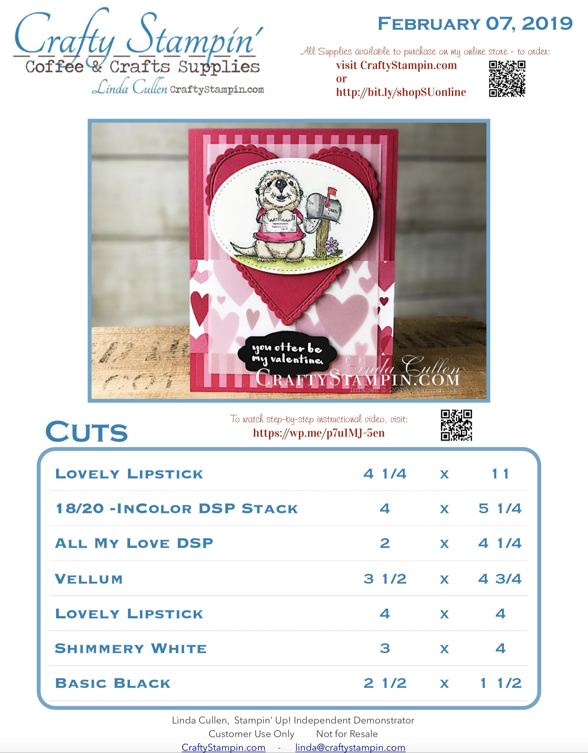 Coffee & Crafts Class: Postcard Pals - Otter Valentine | Stampin Up Demonstrator Linda Cullen | Crafty Stampin’ | Purchase your Stampin’ Up Supplies | Postcard Pals stamps set | Hey Love Stamp Set | In Color 2018 - 2020 6x6 Designer Series Paper | Be Mine Stitched Framelits | Stitched Shapes Framelits | Heart Epoxy Droplets | Stampin Blends | Lily Framelits | All My Love Designer Series Paper