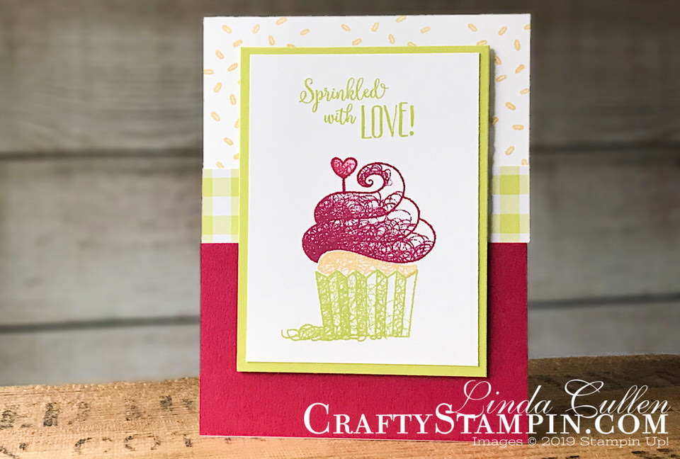 This card just makes me happy! The Stampin’ Up! Sale-a-bration Hello Cupcake Stamp Set is so cute here in Lovely Lipstick, Daffodil Delight and Lemon Lime Twist. I can’t think of a happier cupcake!! The little heart is colored with the Wink of Stella giving it a great sparkle.