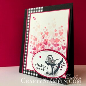 Hey Love Stinkin' Sweet Skunk | Stampin Up Demonstrator Linda Cullen | Crafty Stampin’ | Purchase your Stampin’ Up Supplies | Hey Love Stamp Set | All My Love Designer Series Paper | Duet Banner Punch | All My Love Ribbon Combo | Subtle Dynamic Textured Impressions Embossing Folder