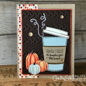 Isn’t this the cutest card? My friend Julie mailed me this card for Christmas and I just had to share. I love the retiring Stampin Up Merry Cafe stamp set and here it is at it’s best paired with Coffee Cafe stamp set and Coffee Cup Framelits. The color combo comes from the retiring Merry Little Christmas DSP that is on the inside of the card, but the card front is a bit shorter showing off the DSP.