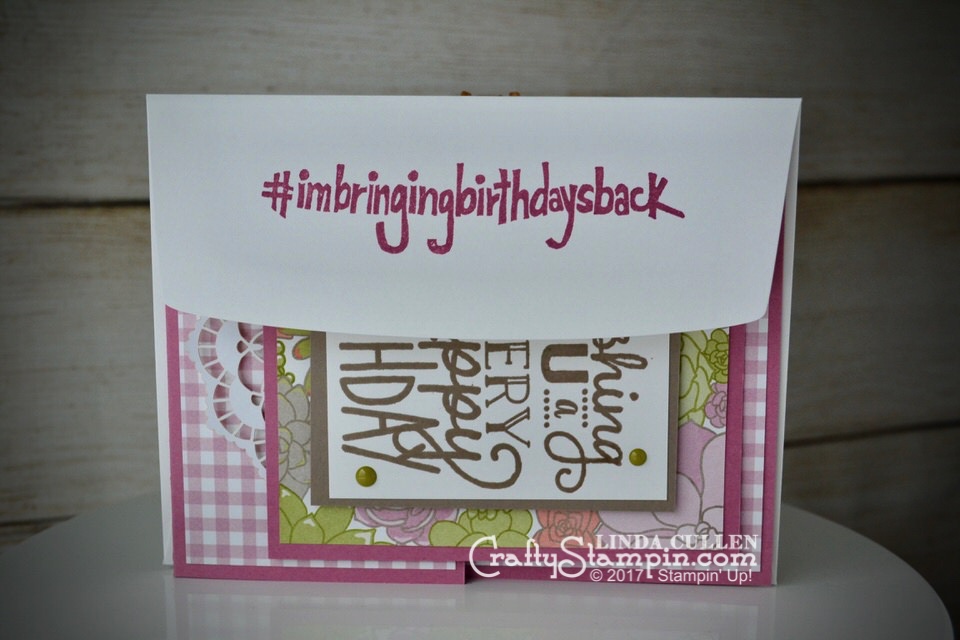 I finished off the card with a stamped Medium Whisper White Envelope stamped with #ImBringingBirthdaysBack stamp.