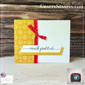Sign up for my weekly newsletter and receive inspiration right to your inbox.  You’ll receive Free Card Tutorials available only to my newsletter subscribers, the latest Stampin Up News, including specials and inspiration, and my Crafty Stampin’ Monthly Customer Appreciation Bonuses.  And don’t worry, your email will never be shared with anyone else, and you can opt out at any time.