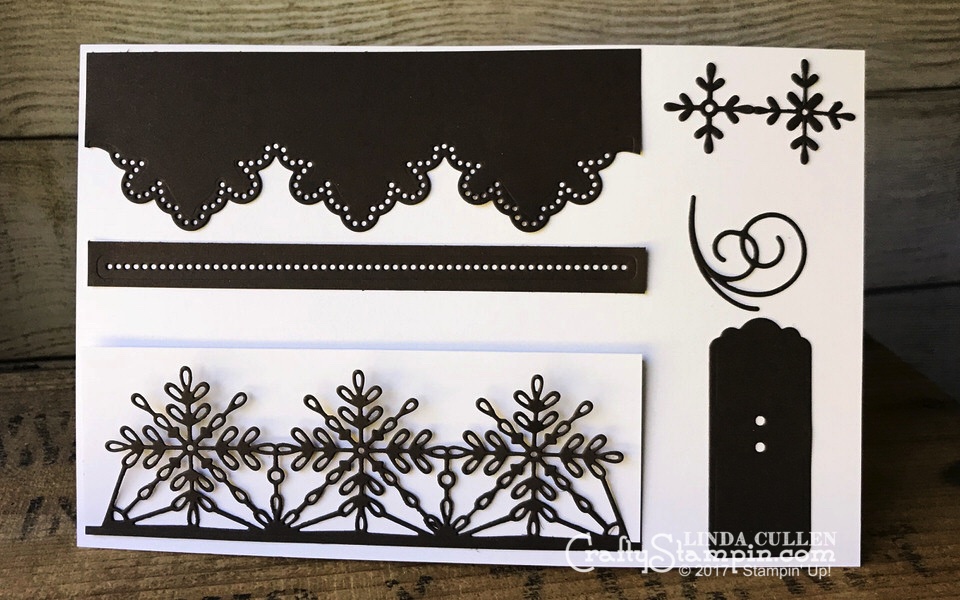 Today’s episode we played with the Stampin Up Snowflake Sentiments Bundle (Snowflake Sentiments stamp set and Swirly Snowflakes Thinlits Dies).  These dies are just yummy.  We had 15 inspiring samples and made one based on a sample in the Holiday Catalog, one of the best sources (after the Scoop) to get ideas for your card making!!