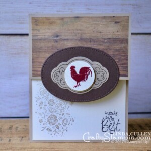 I’m still loving the Stampin Up Wood Textures Designer Series Paper Stack and, I think I’m on my 3rd or 4th pack.  How about you?  This card has a simplistic beauty using only Whisper White and Fresh Fig for the color palette, but the Wood Texture DSP and the Vellum cardstock give it a bit of visual interest.  This is a quick card to create using 1 1/4″ & 2″ Circle Punches.  The rooster, flowers, and greeting come from the Wood Words stamp set.