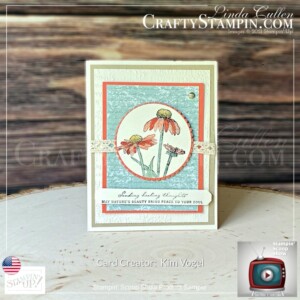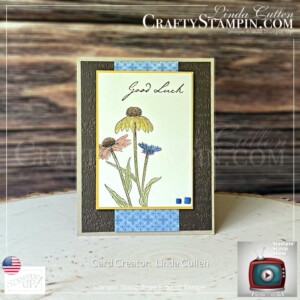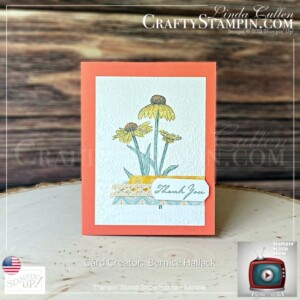 Right now in New England where I live, cone flowers are still at their peak!!  They are just so pretty and come in so many different colors.  I thought the Nature’s Harvest Stamp Set‘s coneflower image is perfect for this time of year.  I colored them with the Watercolor Pencils.  I didn’t blend them, just left them as is. The Watercolor pencils don’t have the exact colors but I think I was able to get a good match. The petals are Cherry Cobbler & Calypso Coral, the cones are Early Espresso, and the stems are Old Olive.