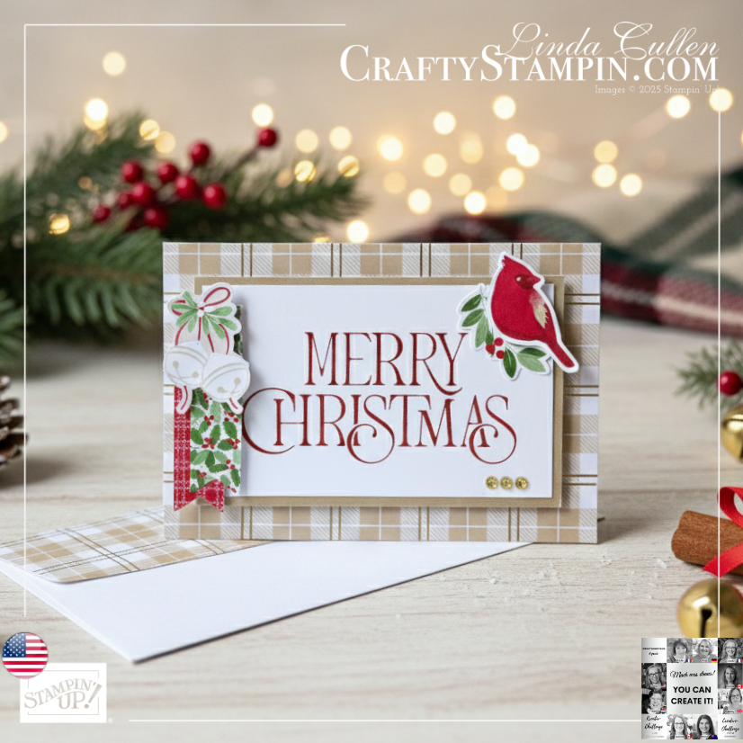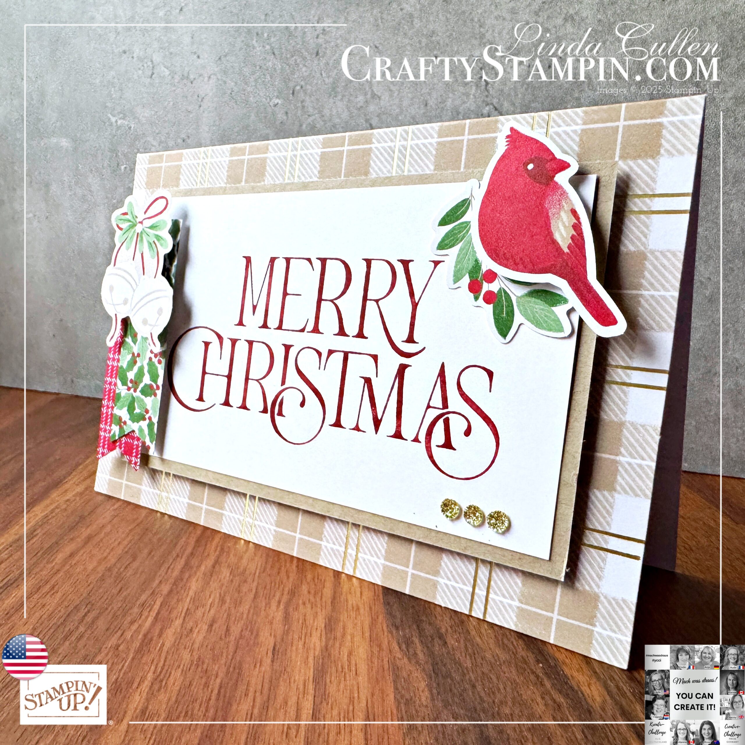 The soft Crumb Cake plaid card base sets a cozy background. I added a simple Crumb Cake layer, then a crisp Basic White panel with the large Merry Christmas greeting stamped in Real Red Ink. The sweet bells and patterned banners are all die cut from the Christmas Tags and More paper, then popped up for a little dimension.