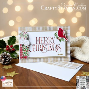 The soft Crumb Cake plaid card base sets a cozy background. I added a simple Crumb Cake layer, then a crisp Basic White panel with the large Merry Christmas greeting stamped in Real Red Ink. The sweet bells and patterned banners are all die cut from the Christmas Tags and More paper, then popped up for a little dimension.