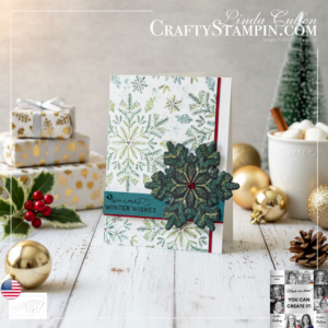 I went classic and cozy. Evergreen snowflakes, a pop of Cherry Cobbler, a Pretty Peacock sentiment strip, and one big layered snowflake as the star. Clean lines, high contrast, easy win.